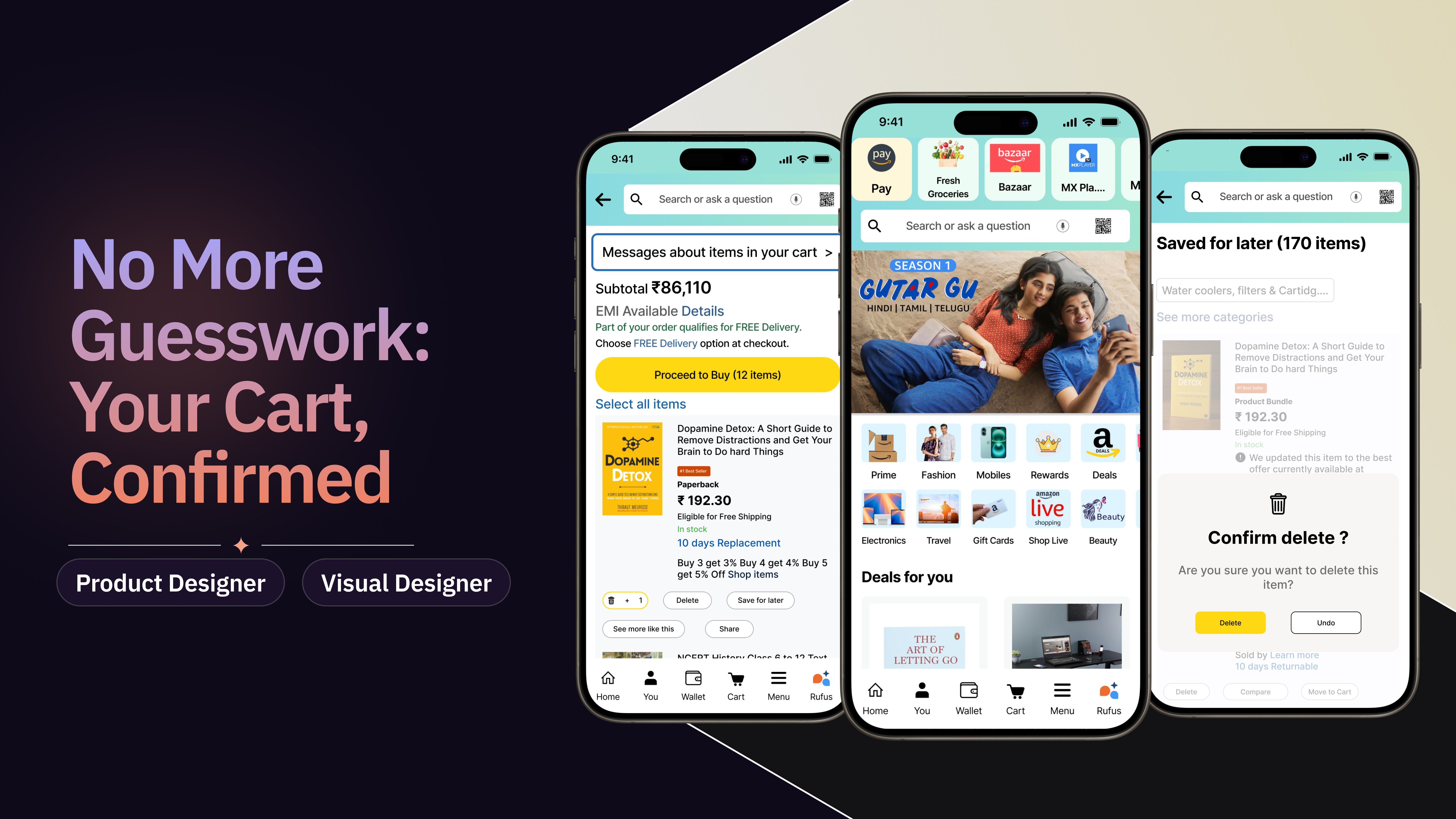 Identified a critical usability issue and designed a confirmation with undo flow, reducing accidental deletions by 40% and improving potential purchase conversion.